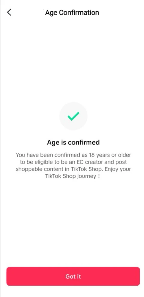 A. 如果年龄确认成功(即确认年龄为 18 岁及以上),您将能够正式获得对 TikTok Shop 的完整访问权限,以相应地添加产品和发布可购物内容。