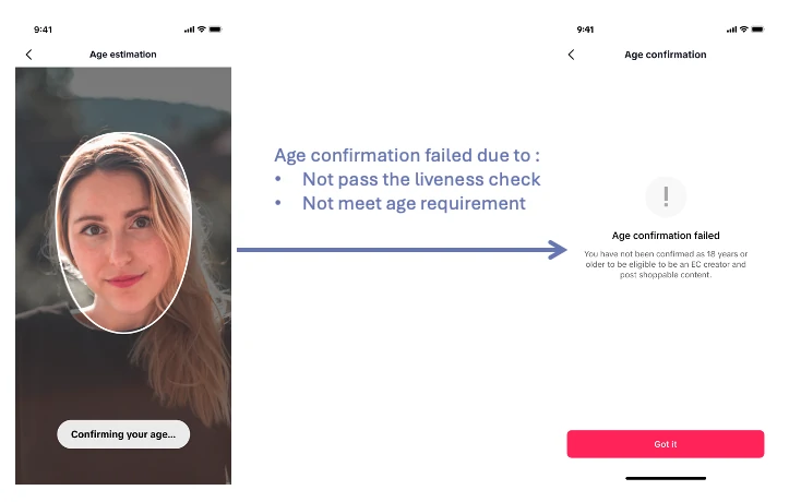B. 如果年龄确认失败(即确认年龄为 18 岁以下或活体检测失败),您将无法获得对 TikTok Shop 的完整访问权限,以相应地添加产品和发布可购物内容。